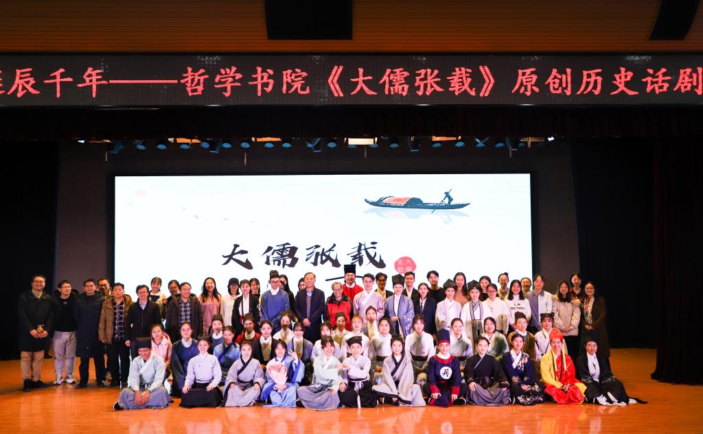 “終南屹屹,先賢巍巍,我們敬畏傳統(tǒng),求學(xué)問道;光影綽綽,書香悠悠,我們學(xué)藝養(yǎng)才,承續(xù)文脈。這是我們的大儒張載!”哲學(xué)書院原創(chuàng)歷史話劇《大儒張載》打磨四月有余,終于公演。這場來自全校11個學(xué)院共計約70余名學(xué)生參與演出的話劇,通過言志、論學(xué)、為政、造道四幕,溯關(guān)學(xué)遺跡,承先賢之風(fēng),以一場藝術(shù)性與思想性高度契合的演出,帶給現(xiàn)場觀眾一次臻于完美的時空交響體驗。