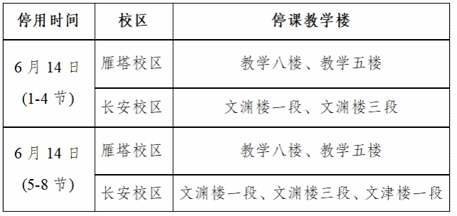 為營造良好的考試環境,屆時將對相關教學樓進行封閉式管理,所涉及教室全部停課。請各學院(部)及相關任課教師根據課程教學需要安排補課,其他需要該部分教室進行的活動全部停止。具體教室停用情況如下:
