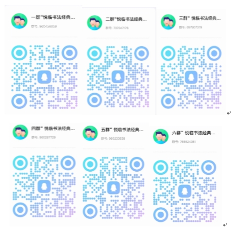 (1)請參與“悅臨書法經典,卌載硯友傳承”臨摹打卡活動學分認證組的學生最晚于7月18日(含)前加入活動QQ群,二維碼如下(選擇一個群加入即可):