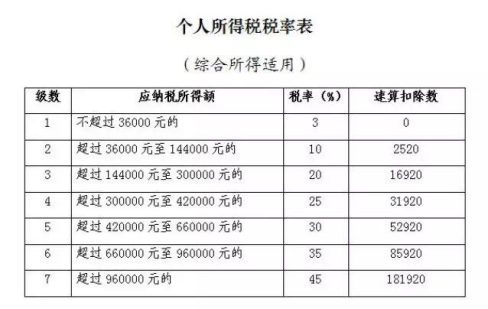 注:(1)專項扣除:指三險一金等;(2)專項附加扣除:包括子女教育、住房貸款利息、住房租金、贍養老人、繼續教育、大病醫療共六項;(3)依法確定的其他扣除:包括個人繳付符合國家規定的企業年金、職業年金,個人購買符合國家規定的商業健康保險、稅收遞延型商業養老保險的支出,以及國務院規定可以扣除的其他項目。(4)稅率及速算扣除數見“個人所得稅稅率表”。
