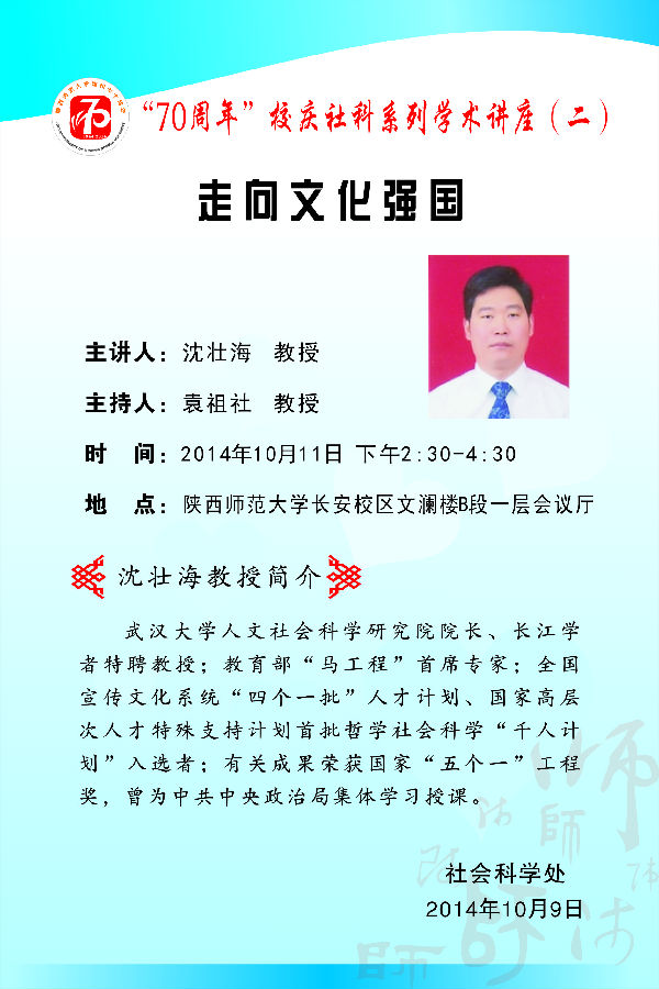 講座題目:“70周年”校慶社科系列學(xué)術(shù)講座(二):走向文化強(qiáng)國