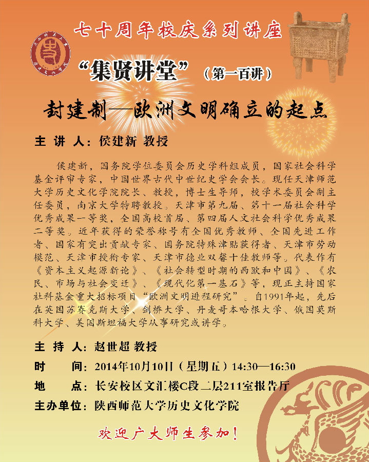 講座題目:迎70周年校慶系列學(xué)術(shù)講座之集賢講堂百期:封建制—?dú)W洲文明確立的起點(diǎn)