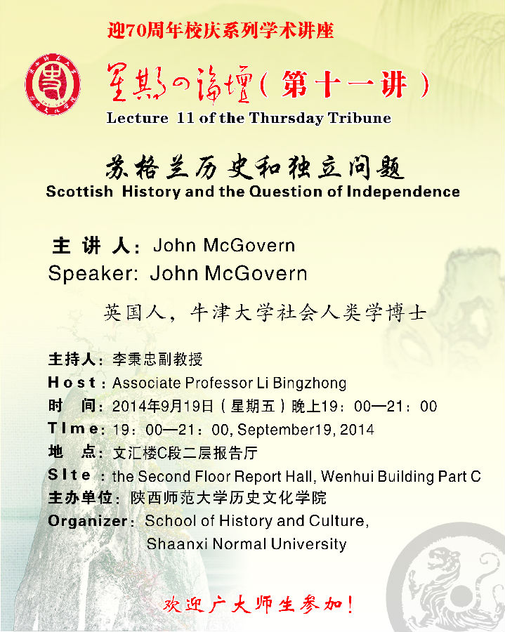 講座題目:歷史文化學(xué)院迎70周年校慶系列學(xué)術(shù)講座暨星期四講壇第十一講:蘇格蘭歷史和獨立問題