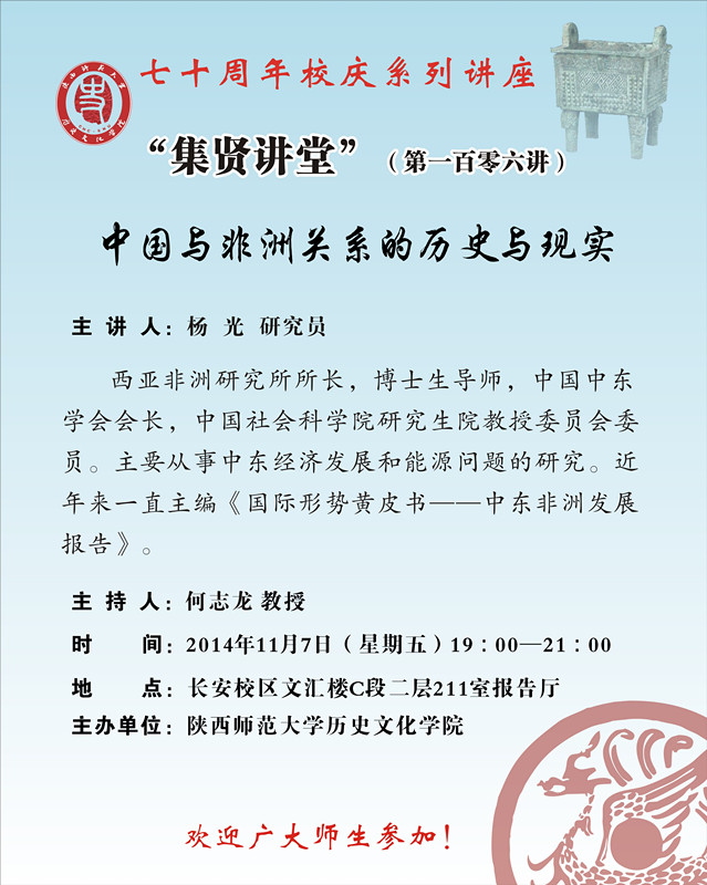 講座題目:迎70周年校慶系列學(xué)術(shù)講座之集賢講堂106講:中國與非洲關(guān)系的歷史與現(xiàn)實(shí)