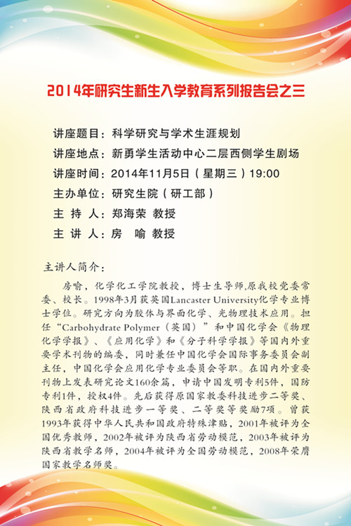 講座題目:2014年研究生新生入學教育系列報告會之三:科學研究與學術生涯規(guī)劃