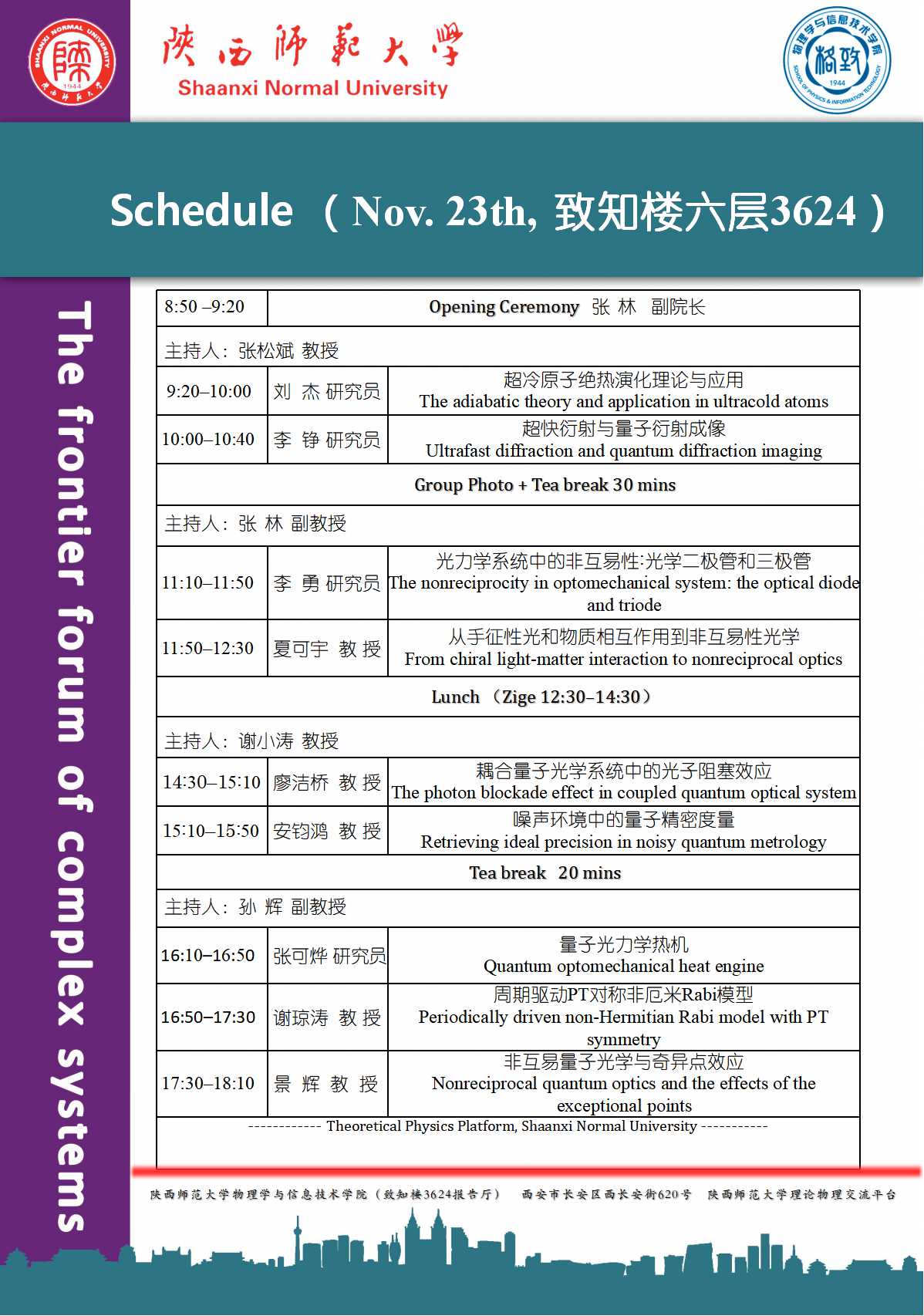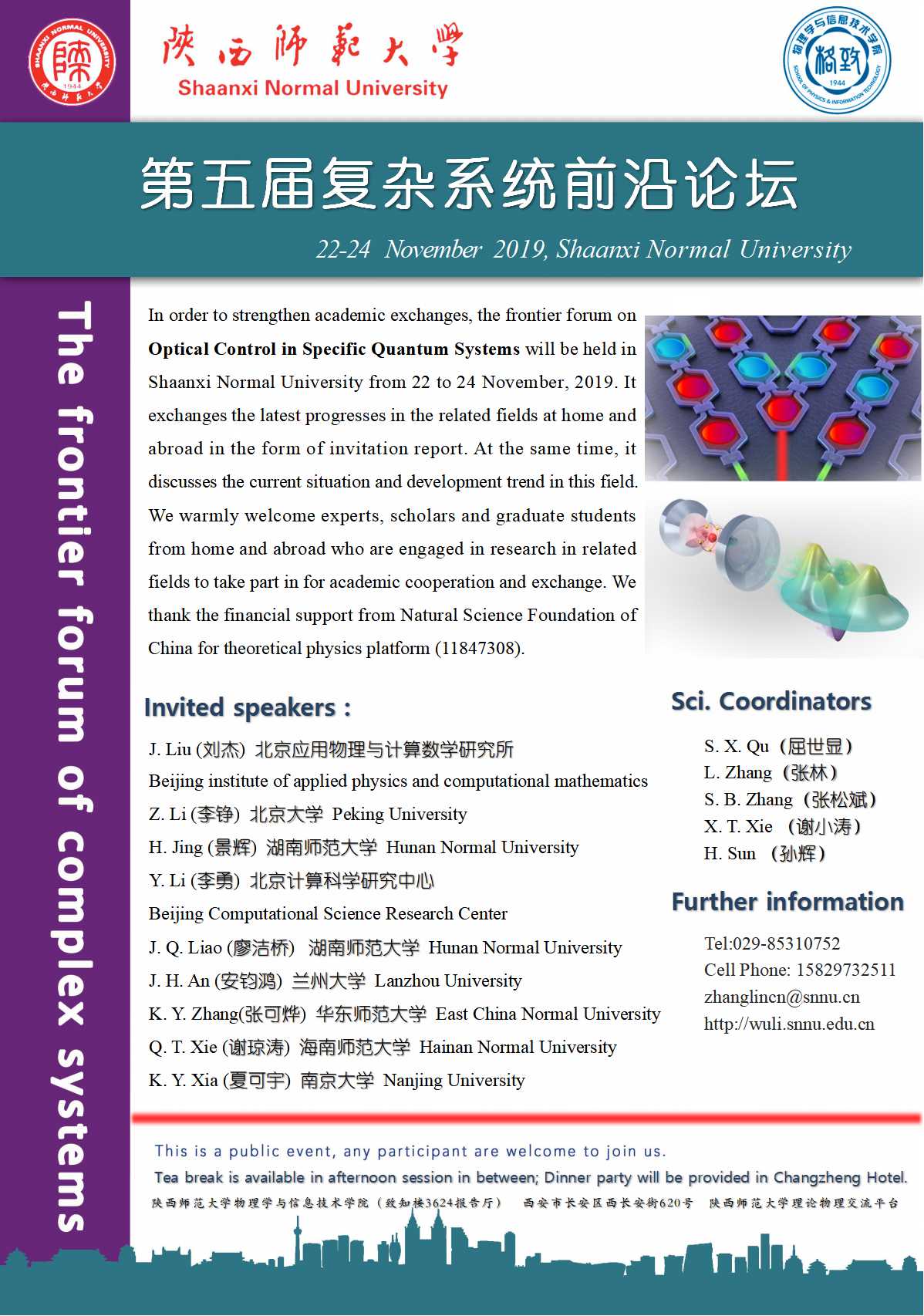隨著量子和微加工技術(shù)向納米領(lǐng)域的深入,量子控制日益成為重要的研究課題。通過光學手段控制量子復雜系統(tǒng)動力學過程的研究表現(xiàn)出了更為廣闊的發(fā)展前景。為加強國內(nèi)外尤其是中西部地區(qū)該研究領(lǐng)域相關(guān)的學者之間的學術(shù)交流,在國家基金委理論物理平臺專項基金支持下,光量子調(diào)控(Optical control in specific quantum systems)專題會議將于2019年11月22日至24日在陜西師范大學長安校區(qū)(陜西省西安市)舉行。會議由陜西師范大學主辦,會議主要以邀請報告的形式,交流和討論在冷原子系統(tǒng)、光力學系統(tǒng)等特殊光學微系統(tǒng)領(lǐng)域光量子調(diào)控的最新進展、研究現(xiàn)狀與發(fā)展趨勢。熱烈歡迎國內(nèi)外從事相關(guān)領(lǐng)域研究的專家學者及研究生踴躍參加,合作交流!