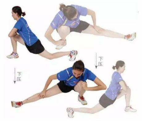 (6)弓步壓腿,以右前弓步為例,雙手叉腰,右腳向前邁一大步,右腿屈膝,腳尖稍向內;左腿膝蓋伸直,腳尖向前,兩腳全腳掌著地,身體正對前方,髖部向下壓,腰部繃緊,重心在兩腿之間。腿做有節(jié)奏的彈動動作,并帶動髖部前送,牽拉左小腿腓腸肌及髖部肌肉。