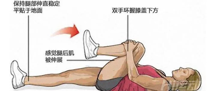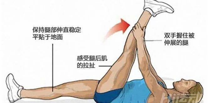 (2)腿后肌伸展,身體平躺于地面,伸直雙腿。輪流將一腳抬起,并保持膝關節伸直固定,然后將腳趾頭朝向身體方向拉。假如柔軟度很好,可將大腿拉近身體,增加伸展強度。