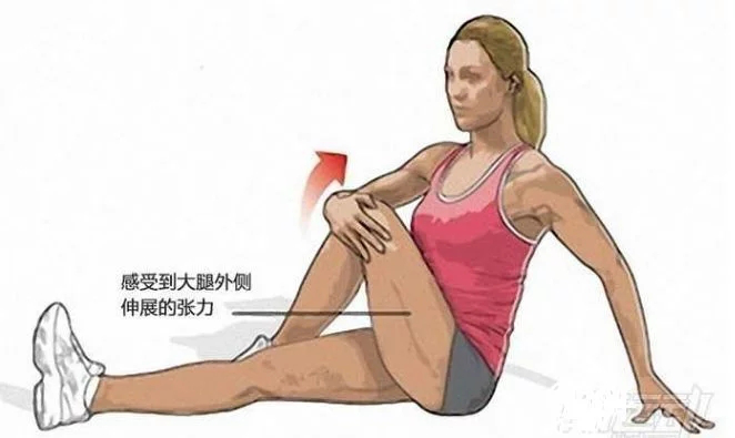(1)梨狀肌伸展,雙腿伸直坐在地面,將一腿屈膝并跨過另一腿,被跨過的腿保持伸直平貼地面。一手撐地使身體穩定,另一手環抱膝蓋外側,然后慢慢加壓直到髂脛束有被伸展的感覺。
