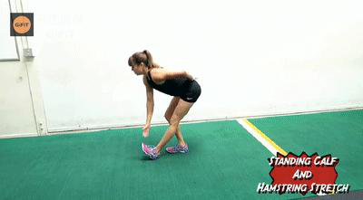 (3)站姿腿后肌拉伸,身體直立,左腳向前邁出一步并勾腳,雙手試探性的向腳尖觸摸,先動態5秒,在靜態10-15秒。