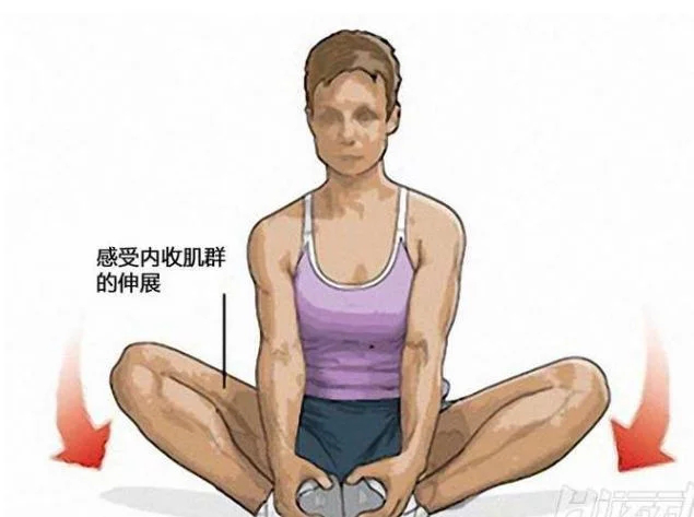 (4)髖部拉伸,身體坐直,屈膝將兩腳掌相對并靠近身體,雙手握緊腳掌確保其緊緊相對。將雙膝緩慢的向地板靠近,當到達極限時,維持姿勢幾秒鐘,然后回復至起始位置。最好有人幫你輔助拉伸。